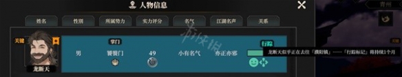 每个NPC的人物情报界面,右上角有一个关注图标,点击关注后会变成橙色。关注之后,去市镇的勾栏瓦舍,找说书人,就能打探NPC的下落。点击左侧关注人物,之前关注过的NPC就会显示出来。选中要打探的人物,即可打探下落。该人物行踪会持续1个月,可按J键随时查看。找到我们要舔的对象之后即可进行每月的舔狗交互,如果相性相符,基本上3个月就能舔成功一个NPC。
