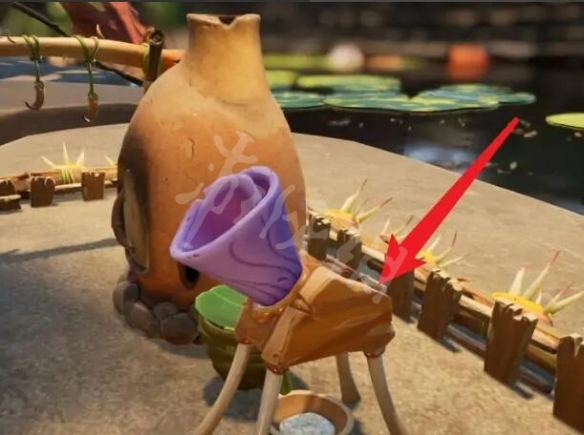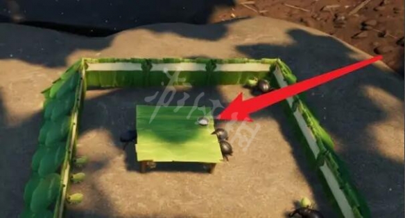 然后用三叶草,植物茎干和草板建造一个下面这样的陷阱,并在中央的桌子上放上稀泥作诱饵。