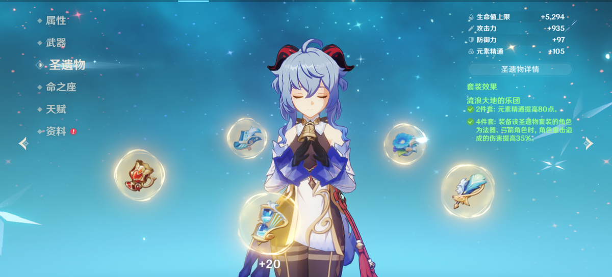 圣遗物其实没什么好说的,就是很常规的4乐园,词缀主堆攻击、精通、双暴。这里提一点,就是甘雨根据不同的武器来选择不同的沙漏(没到200精通可以无脑精通沙),精通沙/攻击沙依据武器选择,4星武器或者低白值武器使用攻击沙,阿莫斯等可以提供大量攻击的武器选择精通沙。