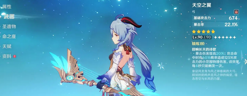如果你准备玩重击流派的甘雨,那五星弓阿莫斯是绝对不可或缺的,这把武器自带的重击增伤效果完美配合了甘雨的输出机制,是甘雨的五星专武,如果你没有阿莫斯,那冬级白星、天空弓、若水也不错。四星武器选择就比较少了,除了试作流月和破魔弓之外其他都不太合适,事实上试作和破魔效果也很一般,一个要射击弱点一个不能开大。
