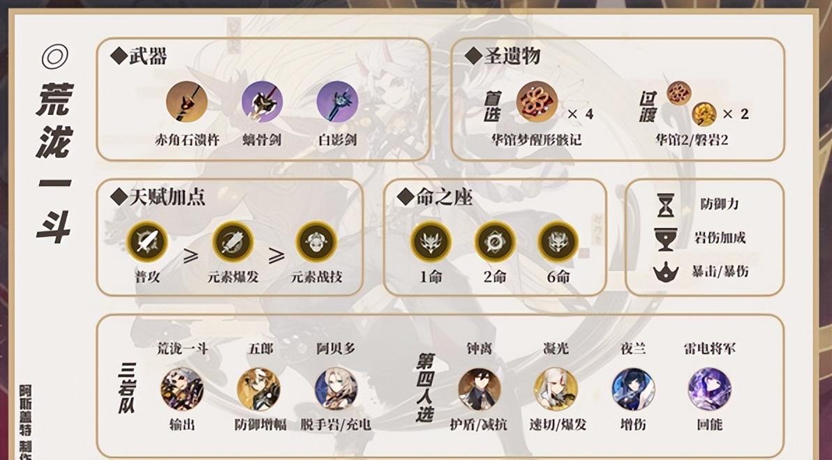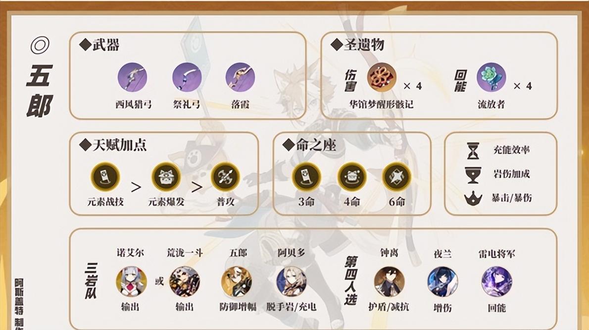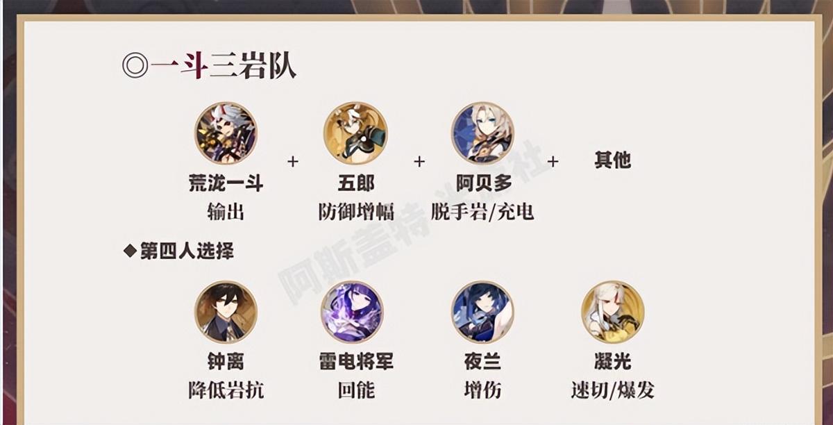 五郎提高队伍场上角色的防御力,6命时可以提高额外岩元素攻击的暴击伤害,进一步提高队伍的输出能力;阿贝多脱手岩补充队伍岩伤,并且产生的岩元素微粒加速一斗的大招循环。