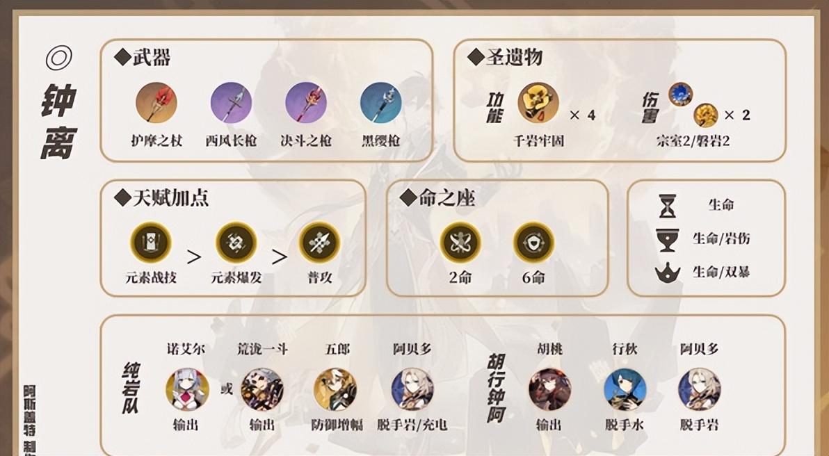 ①.钟离的培养相对简单,多堆叠生命即可提高护盾的厚度,在大多数情况下使用千岩4件,如果想稳定触发教官套也可以选择让钟离佩戴。