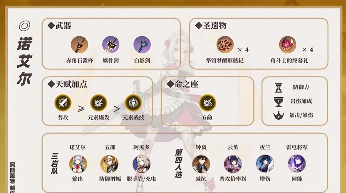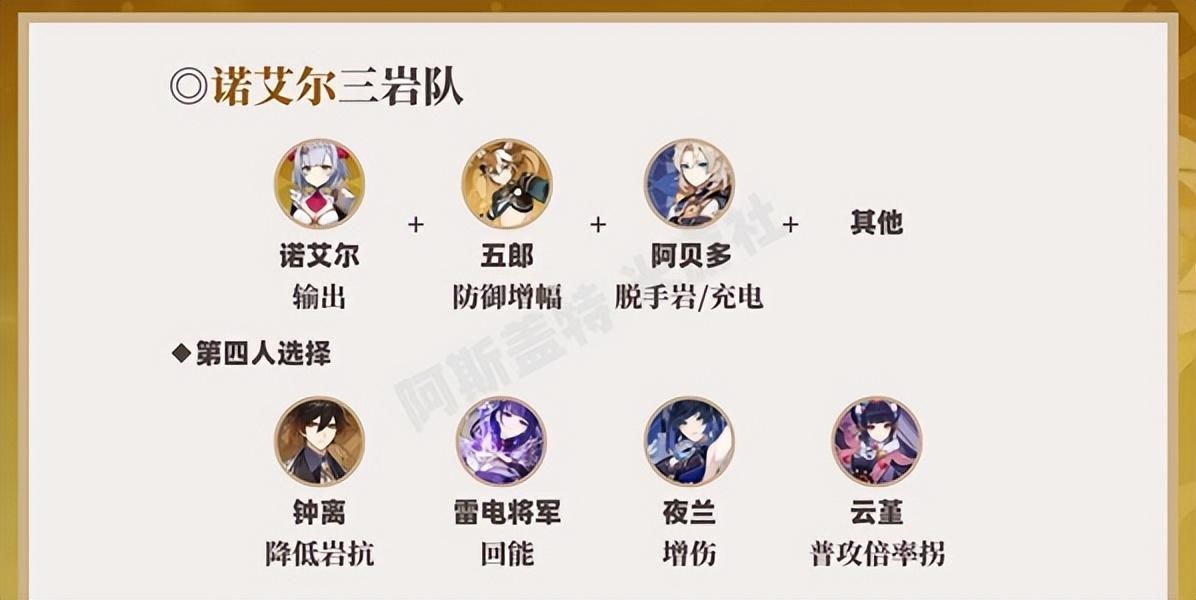 ②.由于诺艾尔自身拥有护盾、治疗能力,因此其他护盾、治疗角色可以不考虑,第四人可选择钟离的原因是降低敌人岩抗,夜兰不仅可以配合诺艾尔的普攻产生协同攻击,而且可以提高场上诺艾尔的伤害。