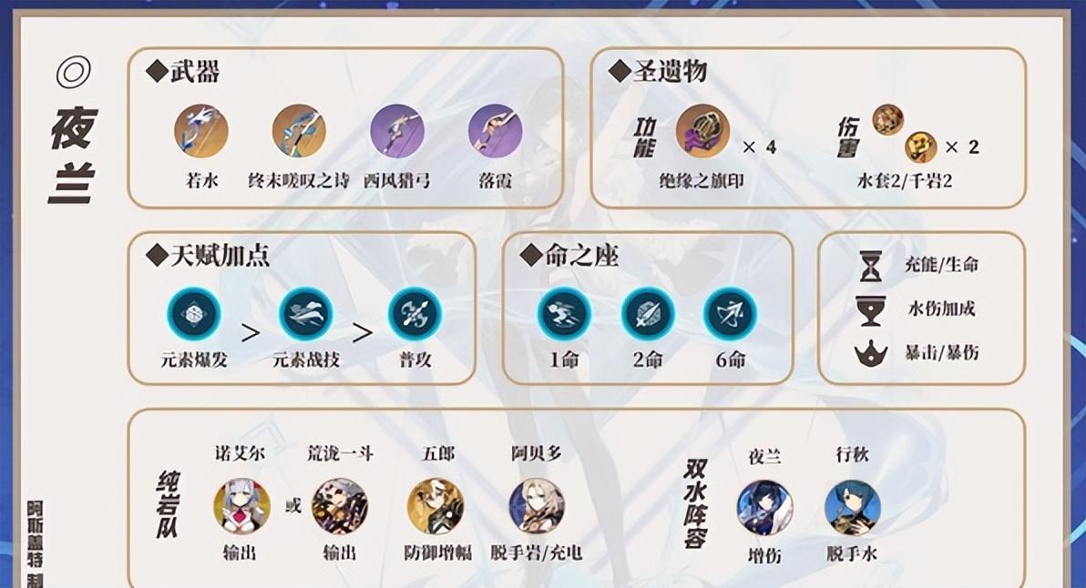 ④.考虑夜兰也可能搭配其他阵容角色,因此如果为了泛用性使充能在200%以上则优先绝缘4,200%以下推荐选择2+2的搭配