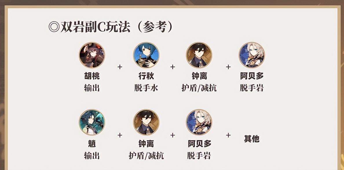 常见的双岩副C玩法有胡行钟阿、魈的双岩玩法等,钟离和阿贝多本身脱手双岩的组合可以搭配诸多队伍。