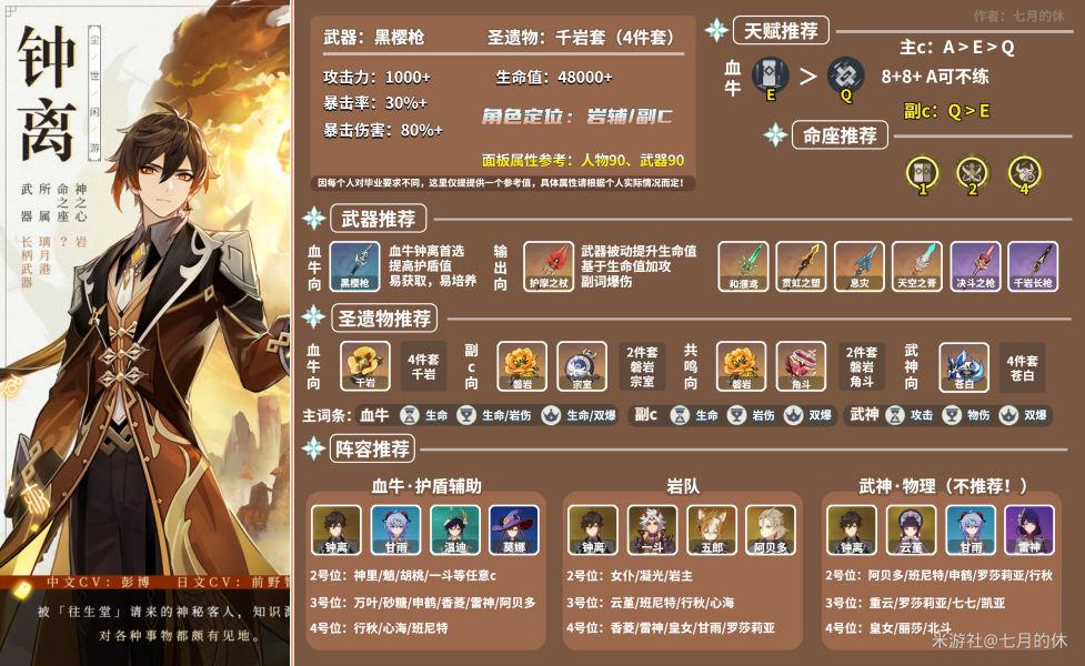 本期带来的是「钟离」的天赋、命座、圣遗物、武器、阵容搭配细致且全面的培养攻略!