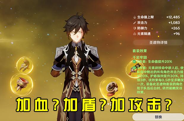 所以,钟离的圣遗物选择,多为加血,但也有配提升队友攻击的。