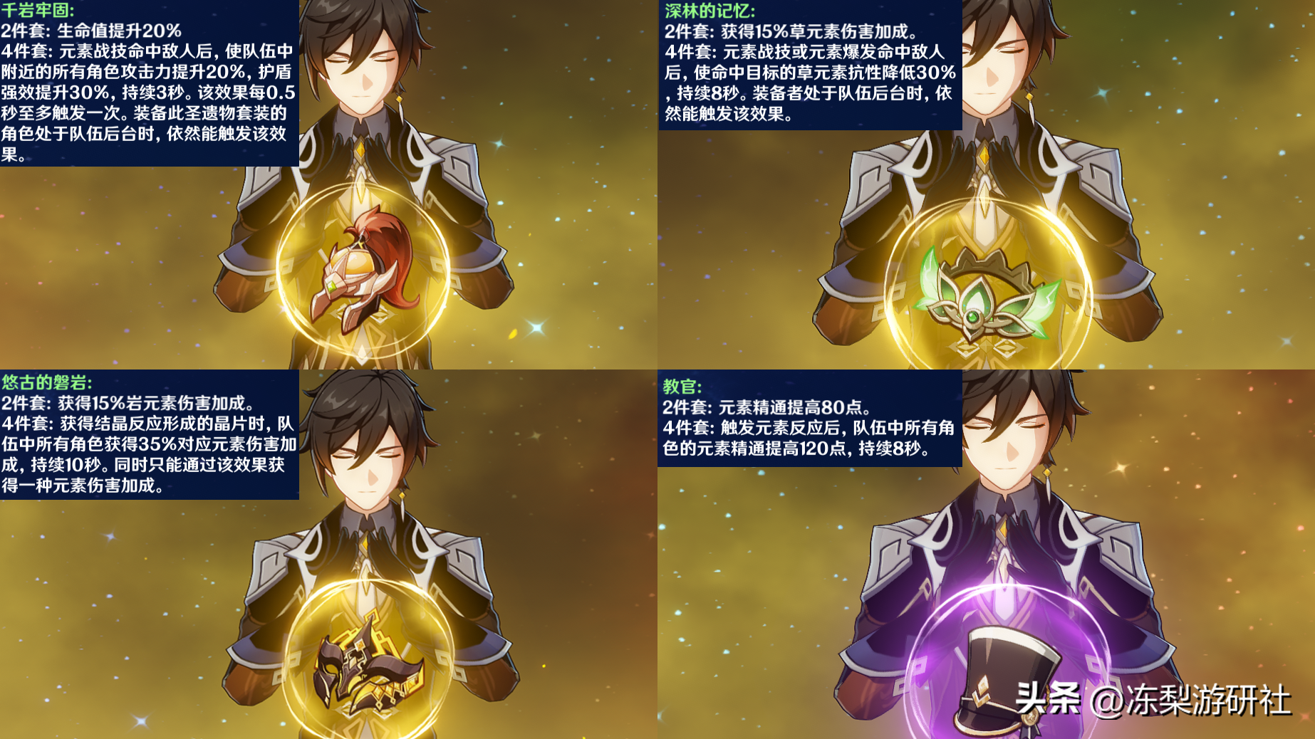 钟离纯粹起盾庇护队友,顺带兼顾减抗的效用。此外,圣遗物方面玩家可选4种: