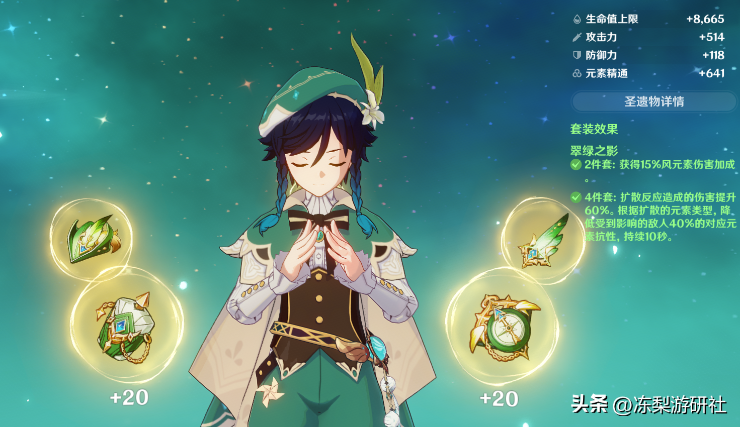 套装方面可用4风套,主词条方面精精精,副词条堆双暴。其中染雷触发的超激化吃精通、等级、双暴、增伤、减抗、减防;扩雷的超激化只吃精通、等级与减抗。全堆精通还可提升扩散伤害,属于是一举三得。武器绝弦165精通,且还带有技能增伤效果,因为队伍存在雷神,温迪充能压力无需担忧了。