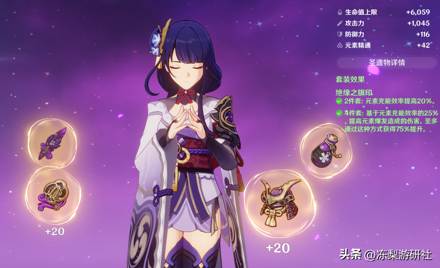 雷电将军,仍然还是那套正常出装,绝缘充雷(攻)暴。超激化勉强算归属于倍率区,一般在高频低倍率类型角色身上提升明显,而我们的雷电将军本身不存在什么特殊的独立附着元素机制,上雷也慢,因此无论是0命还是2命,都是原输出向路线可靠。