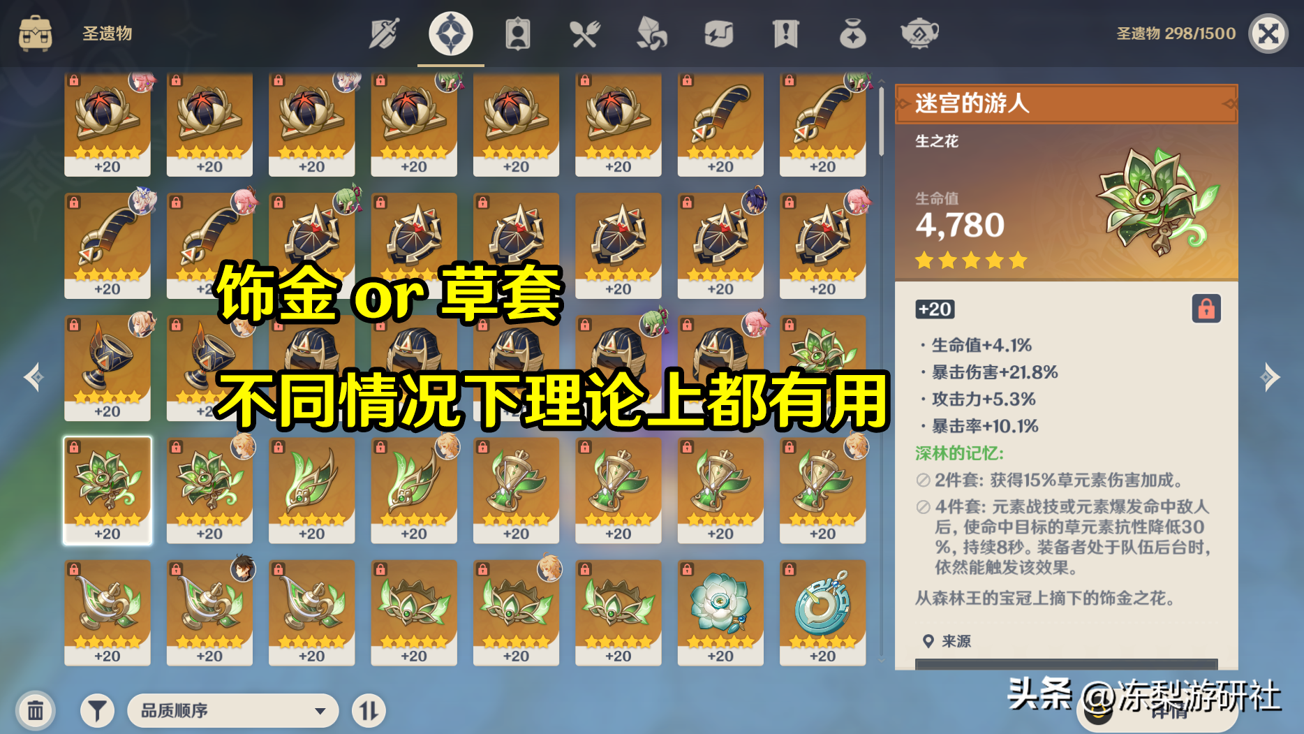 全队无草套时,基本就带深林套了,草伤+草减抗;有草套时,可考虑4饰金在异色队中的高精通加成,也可2饰金2乐团开摆,又或是2草套2精通的增伤精通组合形式。词条方面,3精通或精通数值足够时走精通草伤暴的路线。