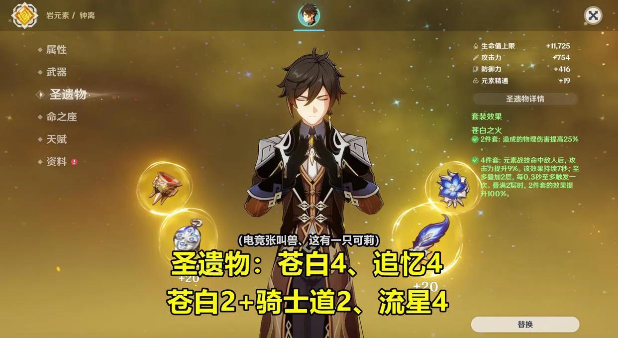 在这套阵容中,钟离主打平A输出,而钟离的平A是物理伤害,圣遗物可选“苍白4”、“追忆4”、“苍白2+骑士道2”、“流星4”,沙漏选攻击力、杯子选物伤加成,帽子选择暴击率或者暴击伤害加成,