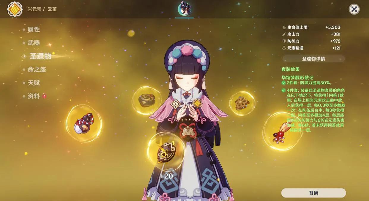 云堇可以使用【西风长枪】+“华馆4件套”,圣遗物尽全力堆防御力,这个不必多说,本来就是云堇的毕业装备。