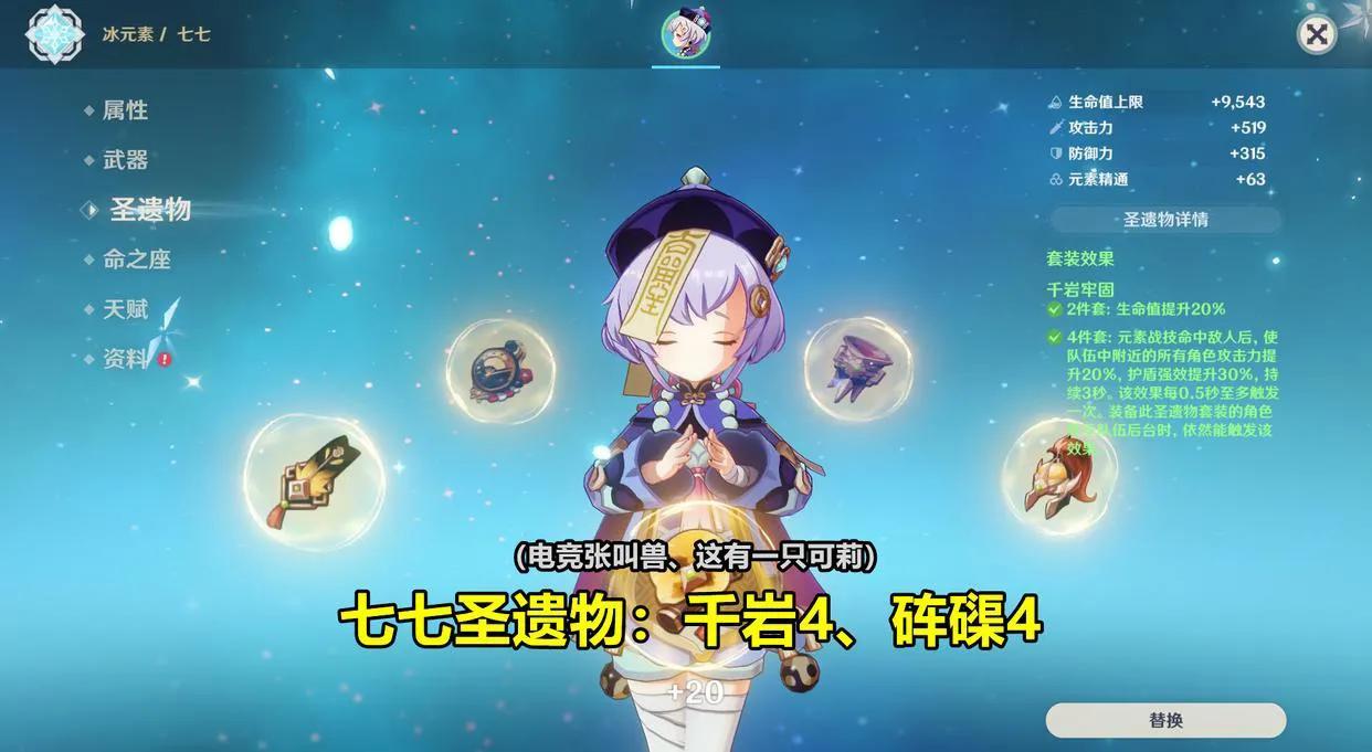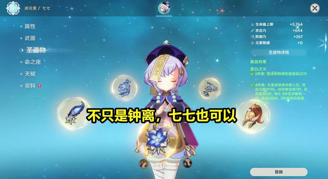 七七的圣遗物推荐“千岩4件套”,可以提升钟离的护盾强度,并为钟离提供20%的攻击力加成。也可以使用“海染砗磲”提供额外的输出,但提升不明显。七七在这套阵容中,主要作用是E技能的挂冰打超导,因此武器要使用【祭礼剑】。