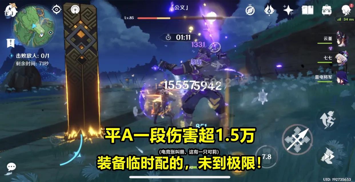 钟离先手长按E技能开盾,并生成岩脊;七七随后开E,为敌人挂冰;菲谢尔开E,持续为目标挂雷元素,触发超导反应;云堇开启大招‘钟离平A输出。我们的小伙伴随意搭配了一套装备后,一段普攻超1.5万的伤害!而钟离一套平A共计6段输出,大约可以触发7次。