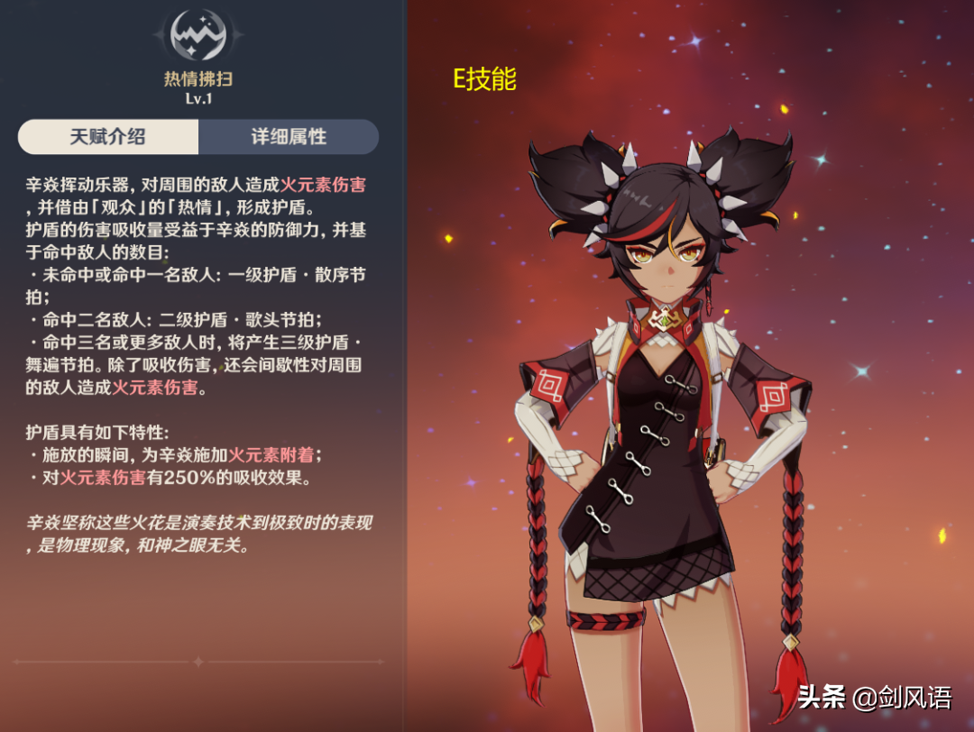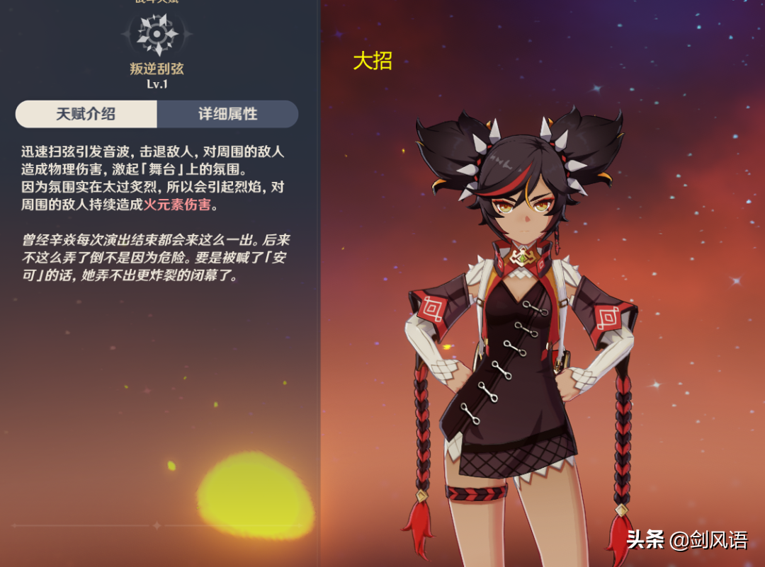 迅速扫弦,对角色前方的敌人造成物理伤害,并在短时间内对角色周围更大的范围持续火元素范围伤害,并有一定击飞效果。