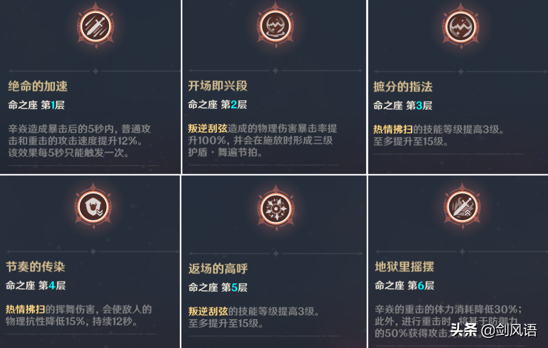 1命和6命则是增加辛焱自身输出,辅助角色意义不大。