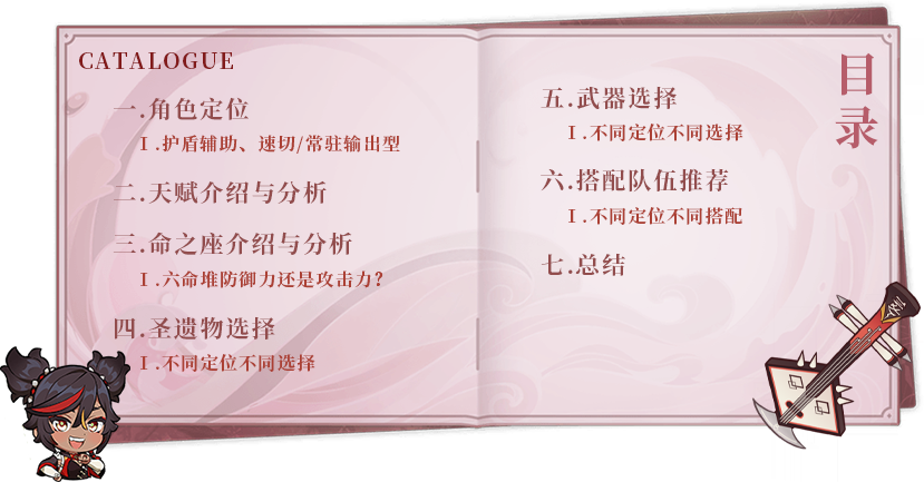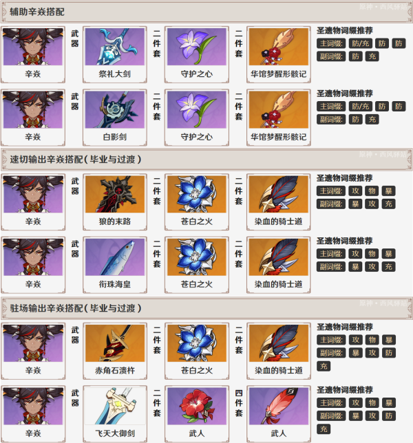 总的来说,该定位的辛焱在没有「祭礼大剑」的情况下,只需要佩戴“防御力”武器即可,开启二命后,可以考虑在“元素充能效率”多付出一些资源,开启四命后,笔者推荐好使用「祭礼大剑」。