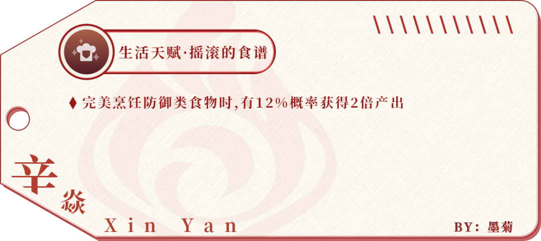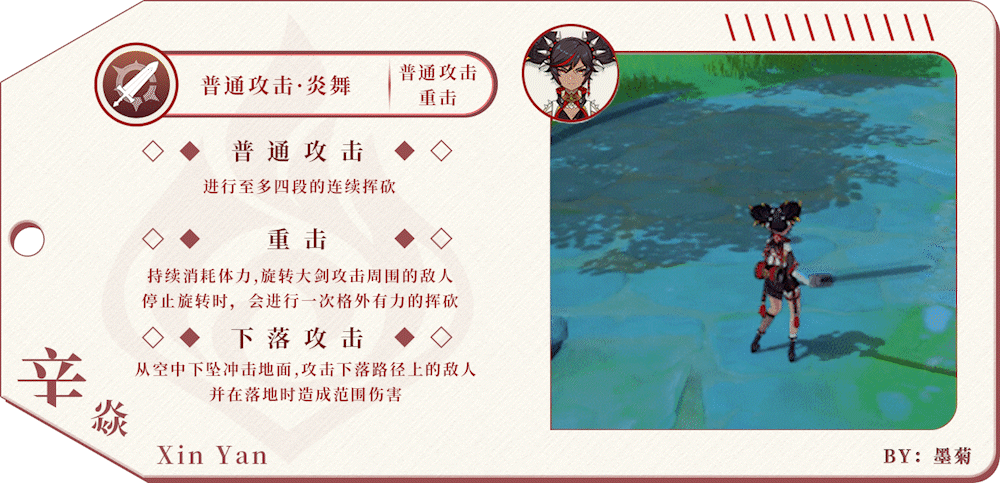 ◎辛焱在施放「元素战技」时,会为自身施加短暂的“火元素附着”;