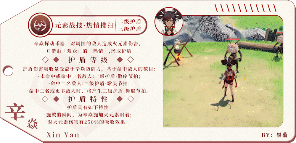 ◎此外,在元素战技产生护盾(无论何种等级)存在期间,进行切换角色操作,均会为切换上场的角色施加短暂的“火元素附着”,可以利用该特性消除一些元素附着型的Debff,为战斗降低难度。