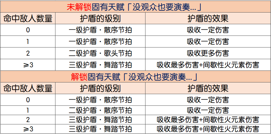 施放该天赋时,辛焱会对自身周围的敌人造成1次火元素伤害,随后,根据此次伤害命中的敌人数量,产生不同效果的「火元素护盾」。根据是否解锁「固有天赋·没观众也要演奏...」,该天赋有着不同的表现,如下图。