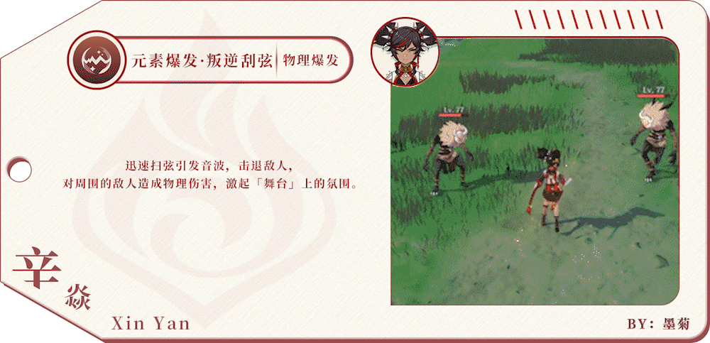 ◎施放元素爆发会为辛焱提供“火元素附着”直到元素爆发结束。