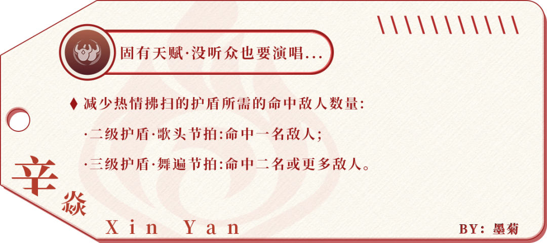 辛焱「元素战技」“命中敌人数量”与“护盾等级”挂钩的机制,实际上对作战环境有一些限制,该天赋能保证对单作战情况下至少拥有“二级护盾”的效果,较大程度上缓解了机制对环境的限制。