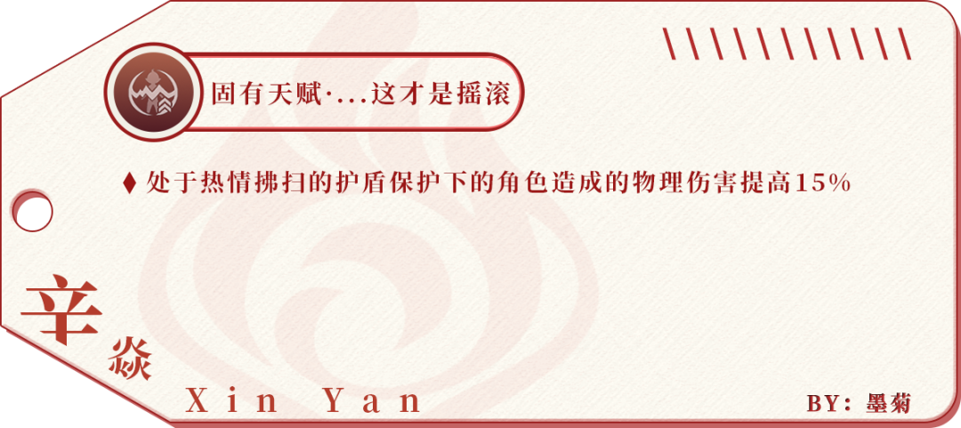 该天赋是辛焱作为『物理增伤护盾辅助』的核心天赋之一,直观的增加面板中的“物理伤害加成”,比较可惜的是辛焱护盾只能保护旅行者“自己队伍的场上角色”,并不能为保护联机中其他队伍的角色,所以仅限单人时的辅助。