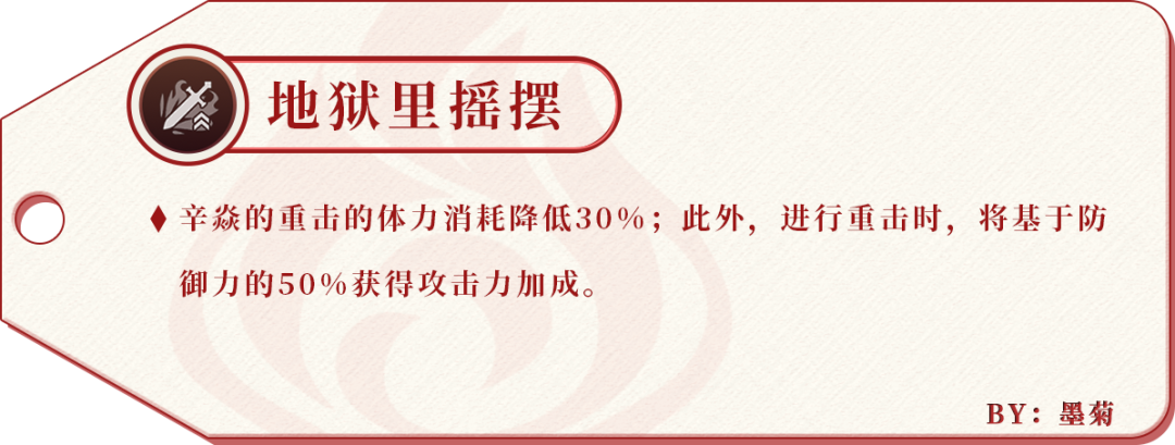 该命座是『驻场物理输出』辛焱的核心命座,它为辛焱主C定位指明了方向——重击,同时为重击输出方式增加了一定数值——防御力百分比转化攻击力。