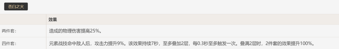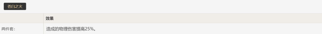 该套装对驻场物理输出的辛焱来说是选择之一,和苍白之火四件套的最大加成相同,比起散搭套来说加成略高一些。但需要消耗较高能量,笔者个人认为有些得不偿失,可作为过渡使用。(笔者自己刷绝缘刷了好几套注连...)