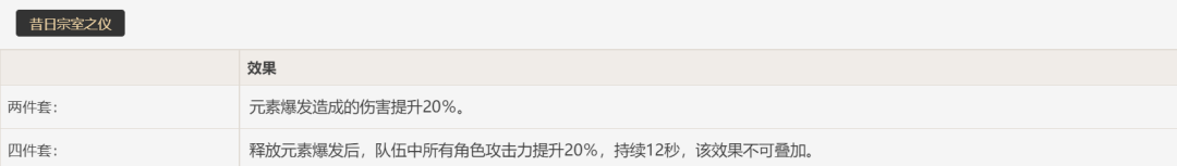 经典的副C圣遗物,佩戴时,辛焱自身元素爆发伤害可以享受到四件套的增攻效果。