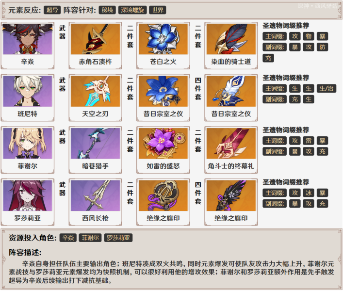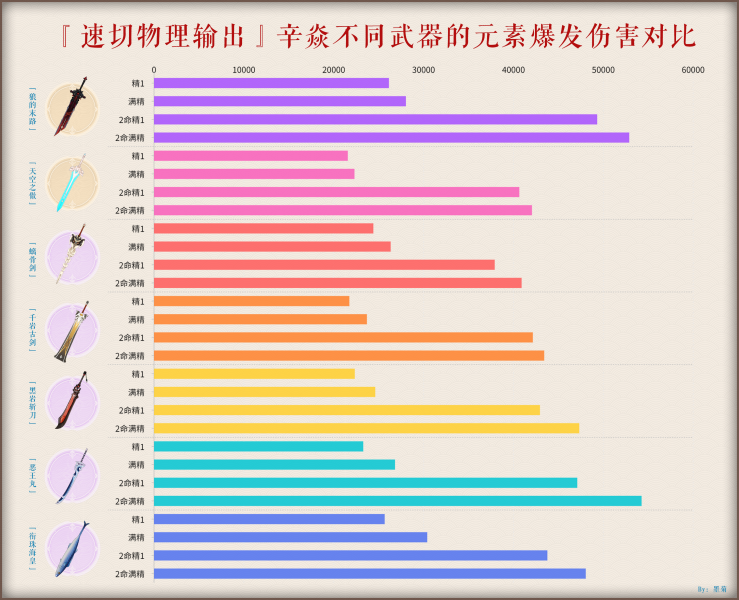 这里就不再对各个武器进行详细的分析了,旅行者们只要明白武器提供的“攻击力”“伤害加成”“暴击伤害”越多,这把武器为二命辛焱带来的提升就越高。