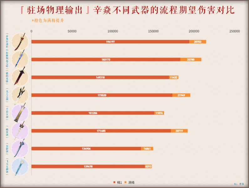 ◎精1情况下,「赤角石溃杵」比起「松籁响起之时」高了一些,随着精炼的提升,这个差距被减小,事实上辛焱的火元素伤害即使没有任何加成,总倍率还是比较可观的,相比于之增加重击伤害的赤角,松籁的精炼能够全面的提高伤害。
