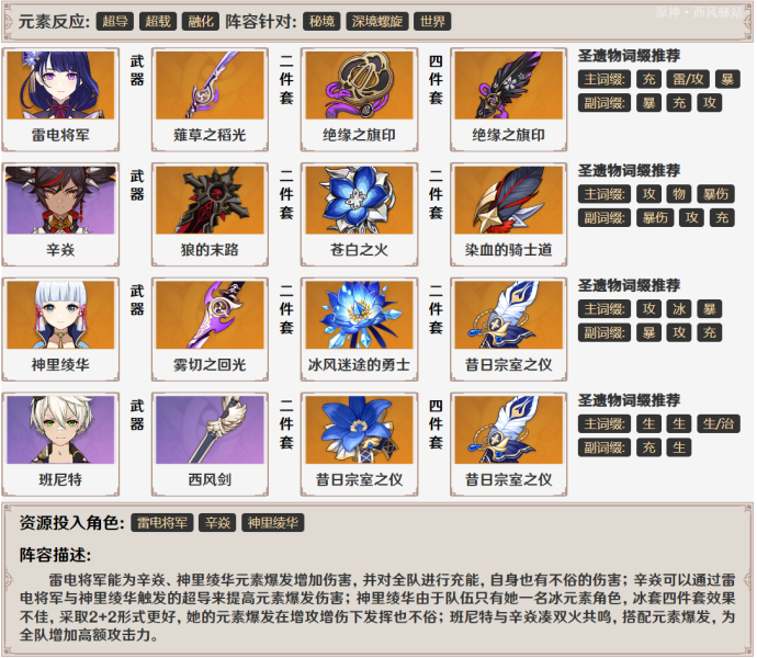 「祭礼大剑」:刷新元素战技可以很好的提高辛焱护盾的覆盖率,变相提高了队伍火元素微粒的产生,副词缀为“元素充能效率”可以缓解二命辛焱利用元素爆发刷新护盾的充能压力。