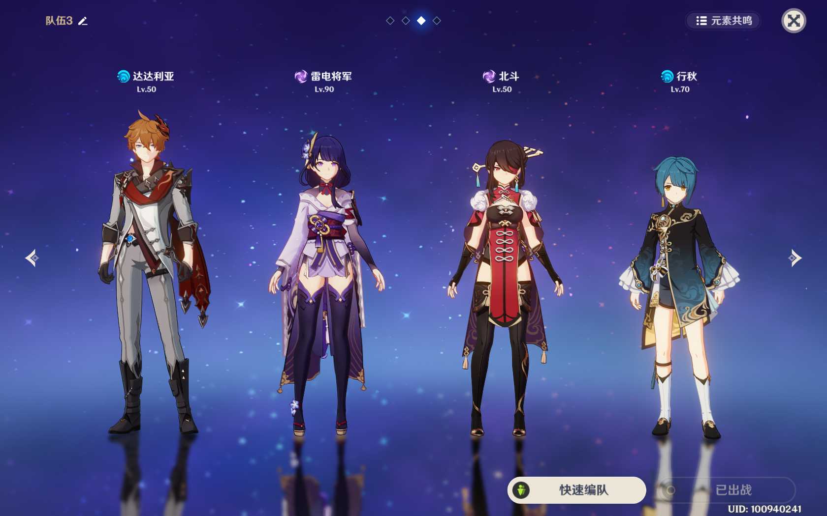 阵容搭配:达达利亚+雷电将军+北斗+行秋。
