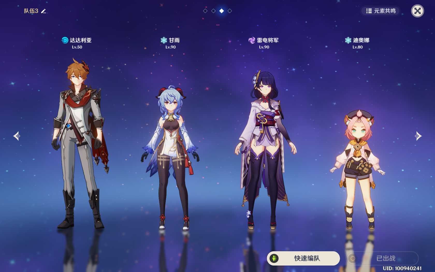 阵容搭配:达达利亚+甘雨+迪奥娜(奶妈)+雷电将军(辅助)。