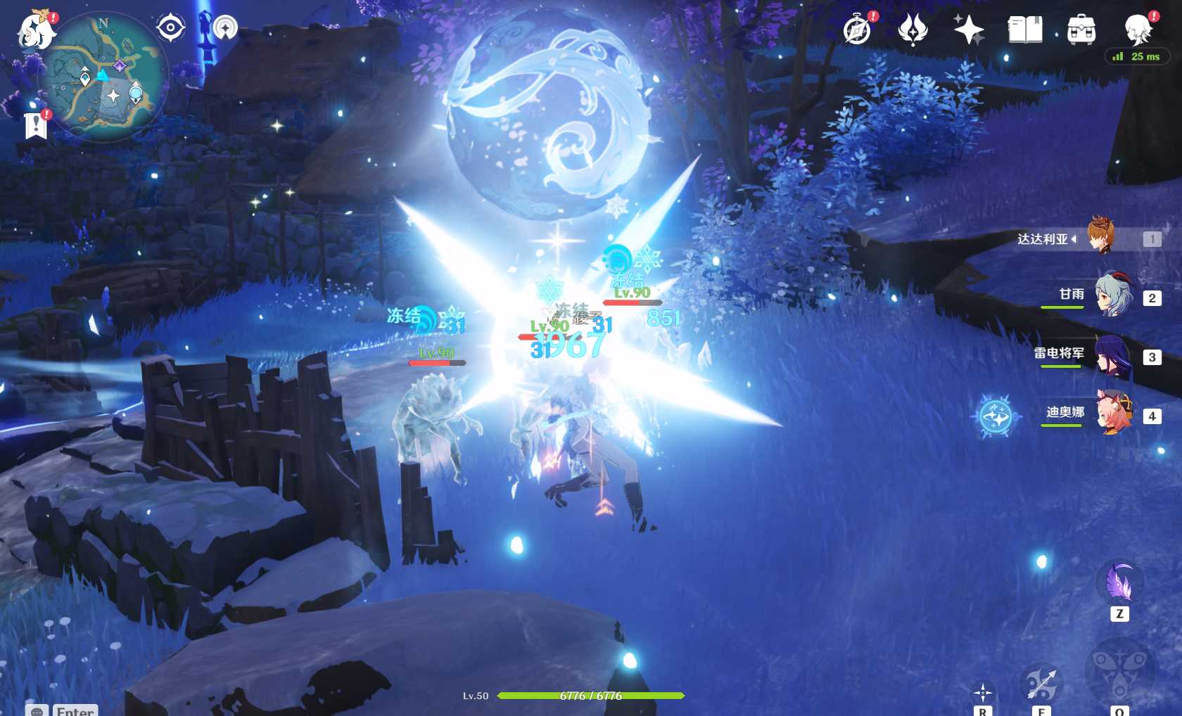 分析:这个队伍的核心就在于公子与甘雨配合打永冻,让敌人长期处于冻结状态,不仅输出高,还能控怪,比较安逸。
