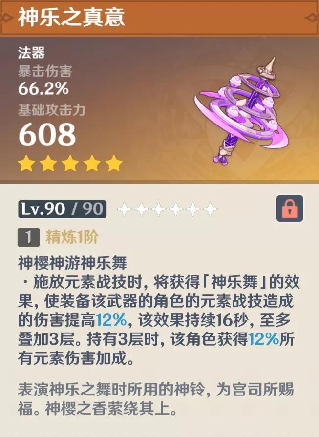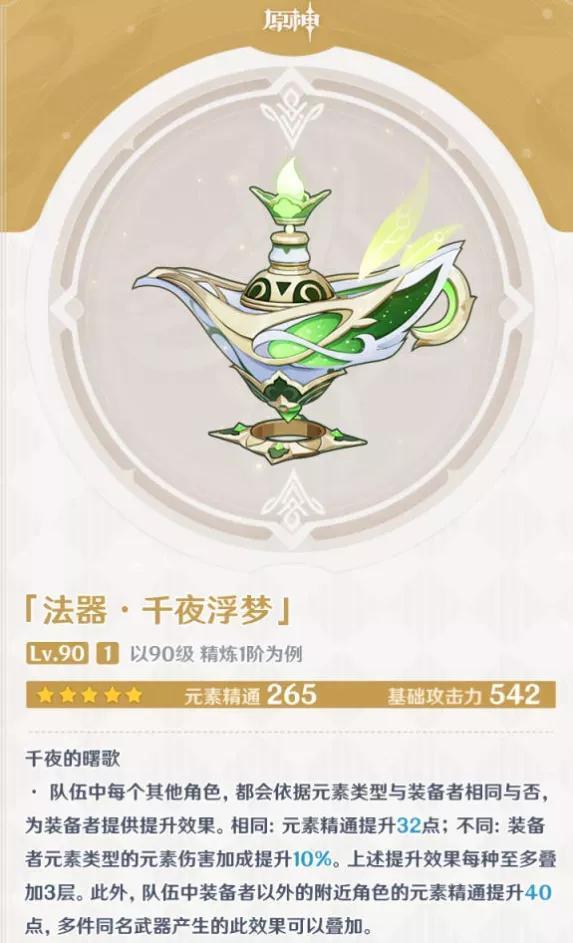 这把武器是纳西妲的专武,副词条是265元素精通,90级的白值是542。它的被效果饰金套有点类似,队伍中每有一个同元素队友给携带者加32点精通,不同元素队友加10%元素伤害。并且另外会给其他三个队友提升40点精通,给队友加精通的效果同名武器可叠加。