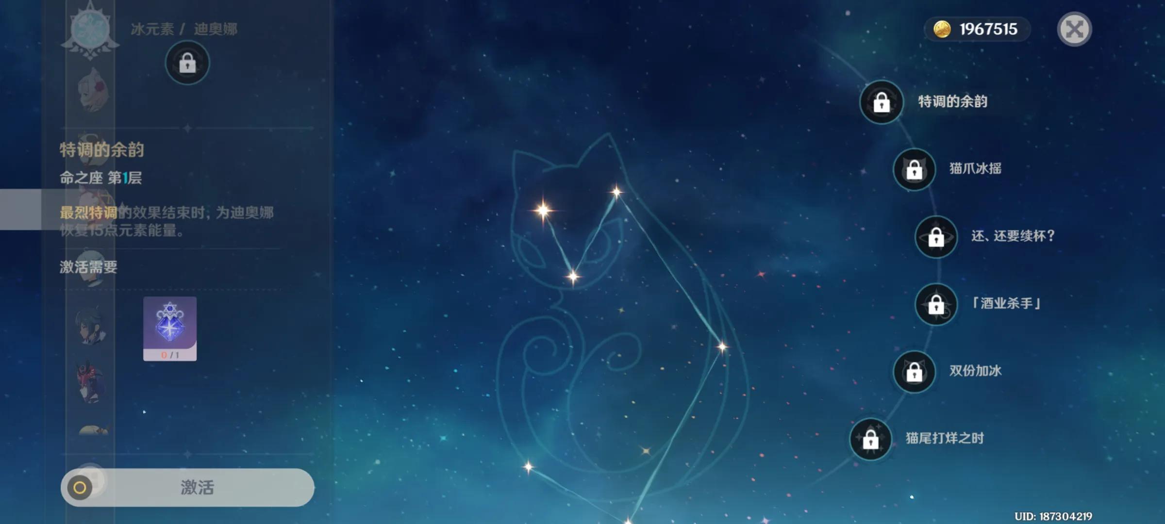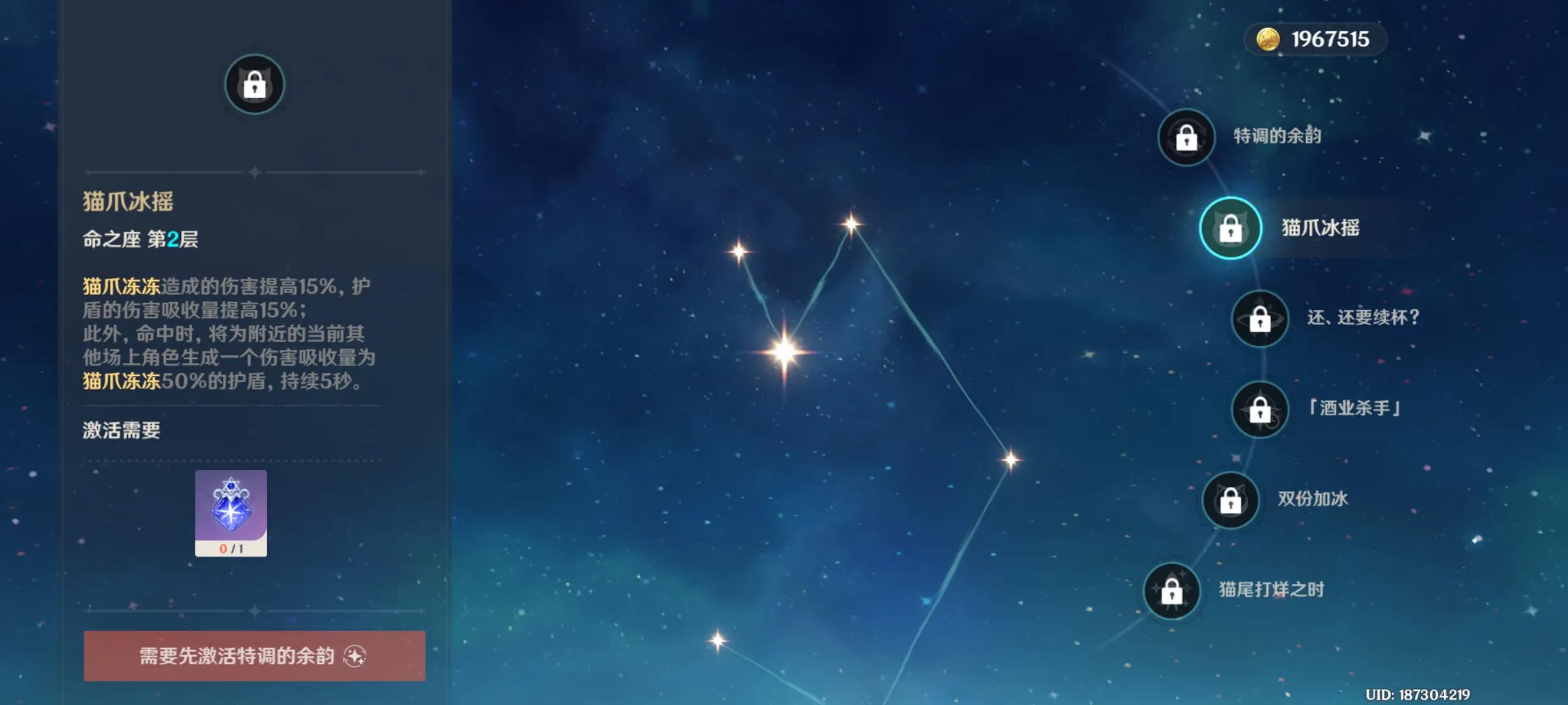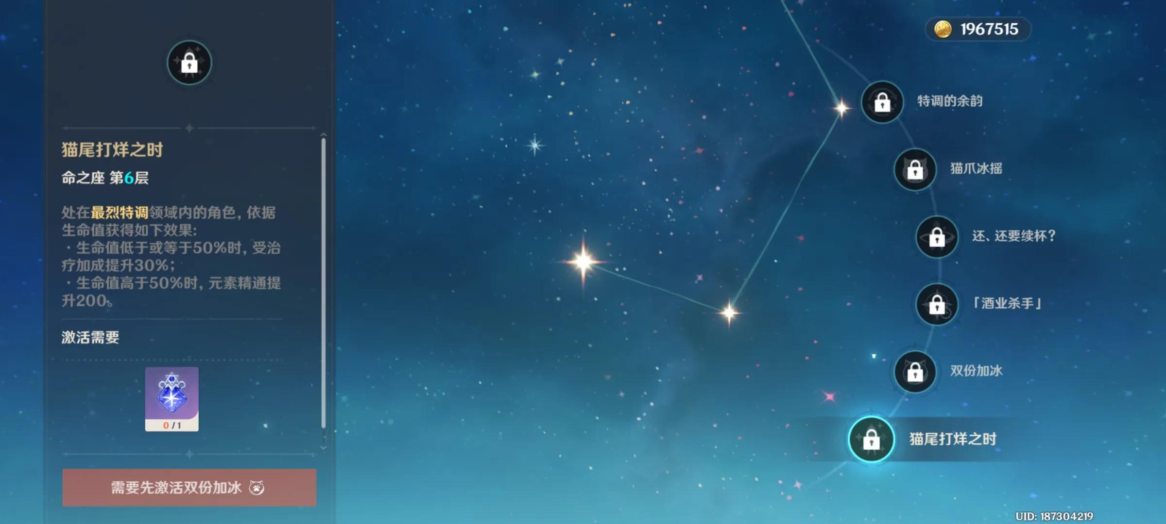 我觉得命座变化比较大的是一二六,一命可以在大招释放时回复15点能量,二命可以在联机模式时给队友套上一个盾,虽然只有我们的一般,六命变化就比较大了,在猫猫大招的范围内我们生命值高于50时可以获得200的元素精通,低于50时提升受治疗效果。