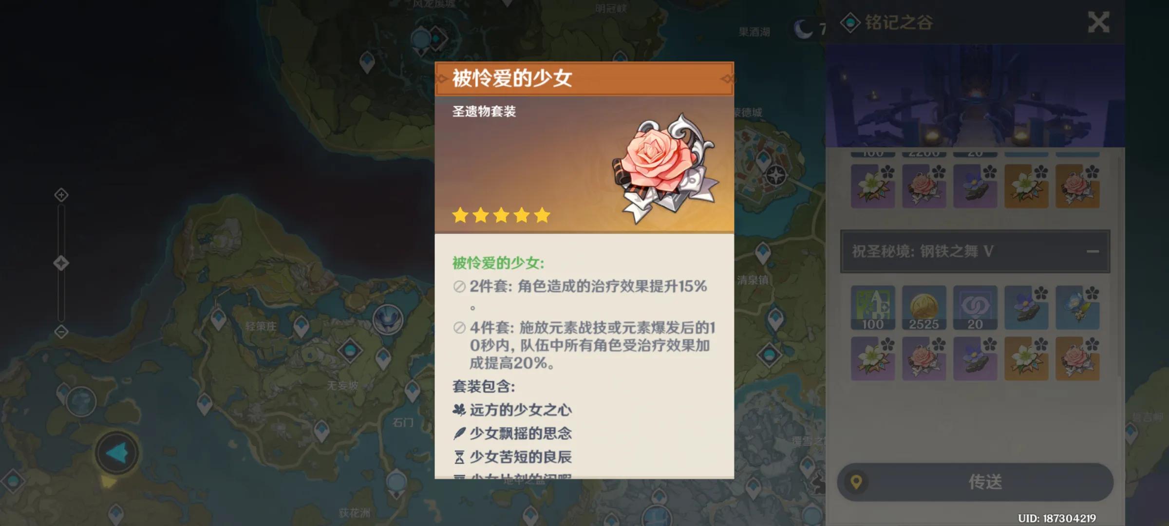 圣遗物方面首推二少女二千岩,圣遗物的主属性首要为生命值即可,因为我们的护盾值是和生命值相关的,如果想要治疗效果高一点,我们还可以带上一个治疗头。圣遗物也可以带四宗室,但是不是首要推荐。
