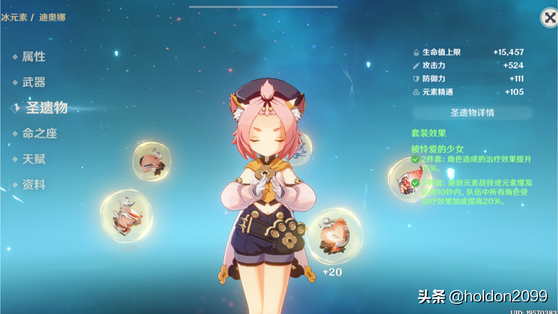 迪奥娜既是奶妈又需要给大家套护盾,而这两种能力都是依靠HP上限来提升的,所以作为辅助,很明显应该给她堆HP属性。然而,由于迪奥娜的治疗能力体现在元素爆发中,有些萌新玩家可能会在刷圣遗物时,选择有治疗加成的词条。虽然这不是一个很糟糕的想法,但它一定不是最佳方案。比如你选择了一个治疗头,那确实能增加迪奥娜的治疗能力,但这对于护盾厚度毫无帮助,但如果全力给她堆HP属性,那就可以同时调高奶量和护盾厚度。
