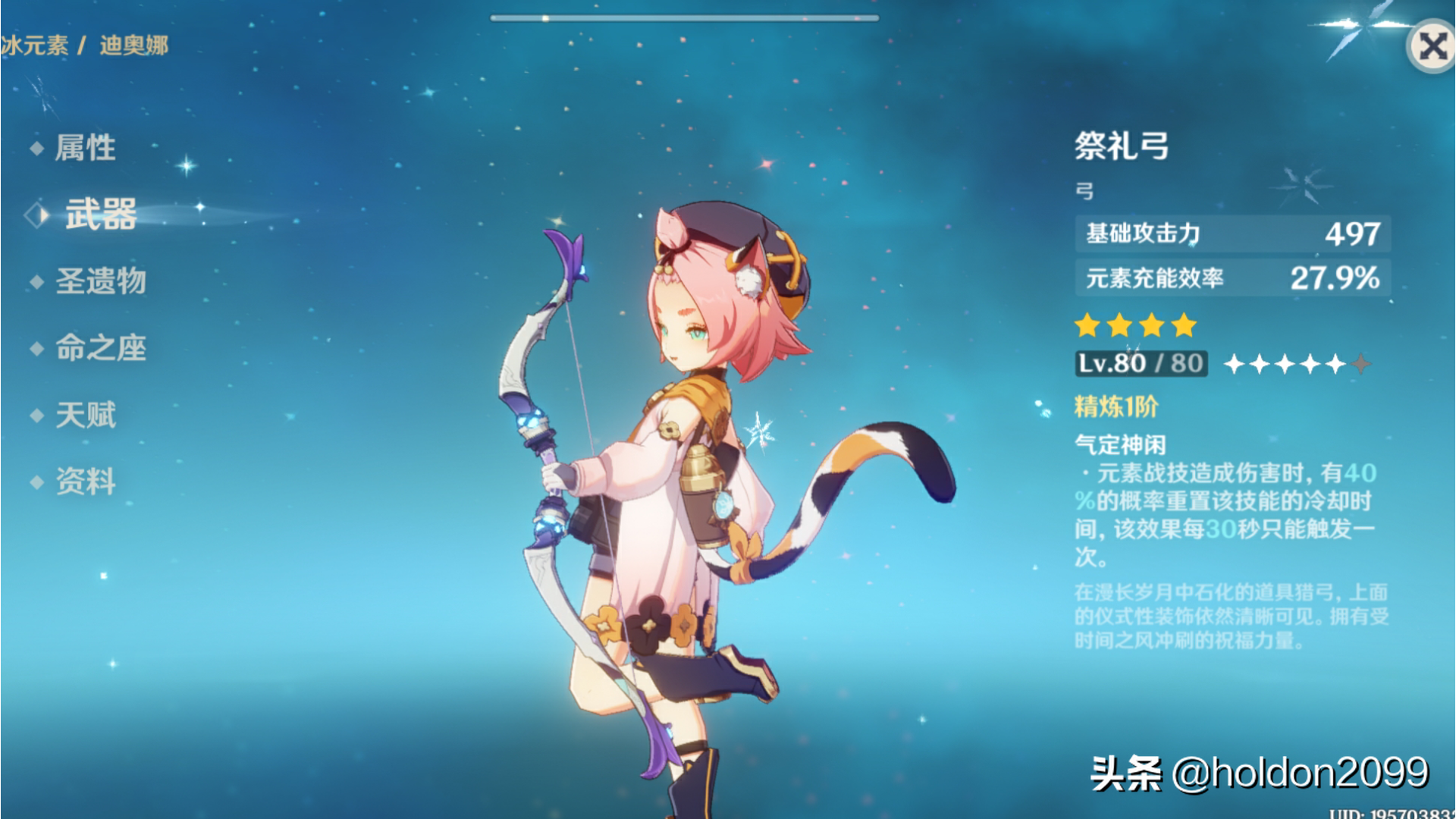 作为辅助,终末嗟叹之诗是目前唯一一把适合迪奥娜的五星弓,增加充能效率的同时,还能在释放大招后,在后台继续发挥作用,1阶就能增加100点元素精通,和20的攻击力,持续12秒。与5星武器的情况不同,4星弓的选择较多,其中祭礼弓甚至比终末更适合迪奥娜。