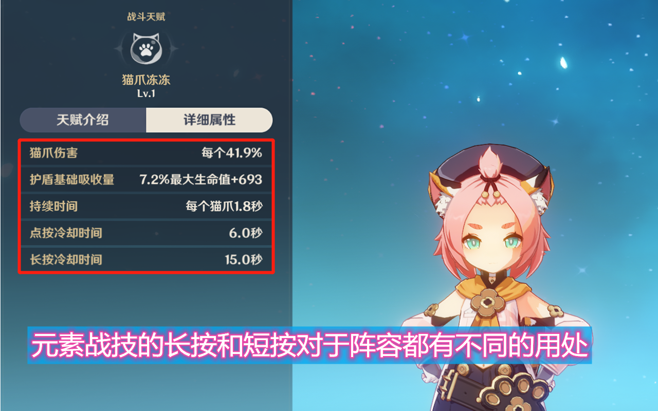 迪奥娜的元素战技在使用后,可以形成一个冰盾,并给角色身上添加一个冰元素附着,可用来对抗地脉异常,虽说护盾没有钟离的厚,但在护盾角色里也是比较高等的存在了,而且只要玩家们提升生命值上限,还能一直对其进行提升,不过迪奥娜的护盾唯一的问题,就是长按和短按的冷却时间,两种各有各的好处,这里只能建议玩家们练度低的就短按,高的话就长按,并且在战斗的时候,依靠对手的强度,进行适当的调节,尽量不要硬钢,打迂回战术,便可让自己的生命安全得到保障。