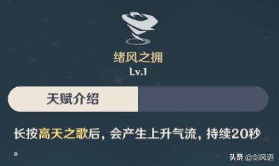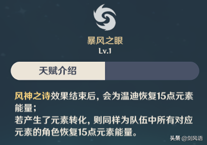 1.如下图,突破固有天赋后,大招结束后恢复15点元素能量,温迪的大招实际只需要45点元素能量。若元素转化,同样恢复队伍对应元素角色15点元素能量,充电宝功能。