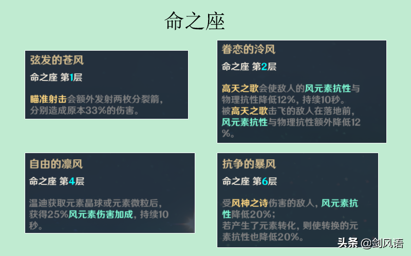 4命,获取元素微粒或者元素晶球后,提高25%风元素伤害加成。