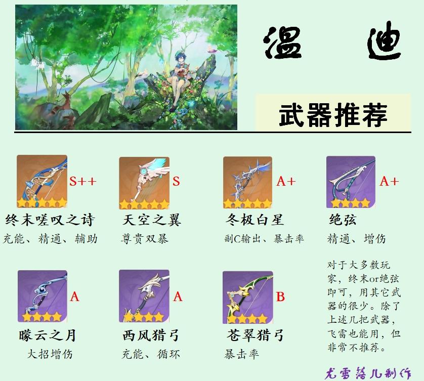 其它武器:飞雷之弦振、苍翠猎弓、风花之颂等武器也非常不错,但缺乏竞争力,可行而不推荐。