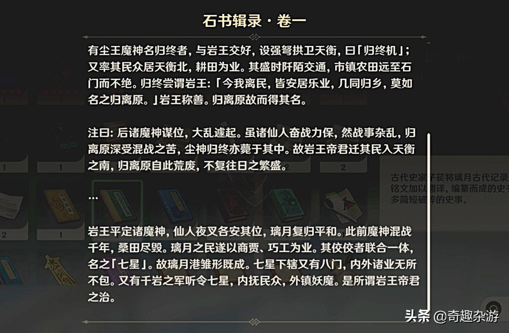 钟离作为最年长的七神之一,有着很多故事,而尘封最久、最深沉的故事,就是“尘神归终”。关于这个人的故事,只出现在典籍中,介绍归终和钟离,曾经一起携手创立璃月,然而神魔大战开始,归终在保护璃月的战争中死去。