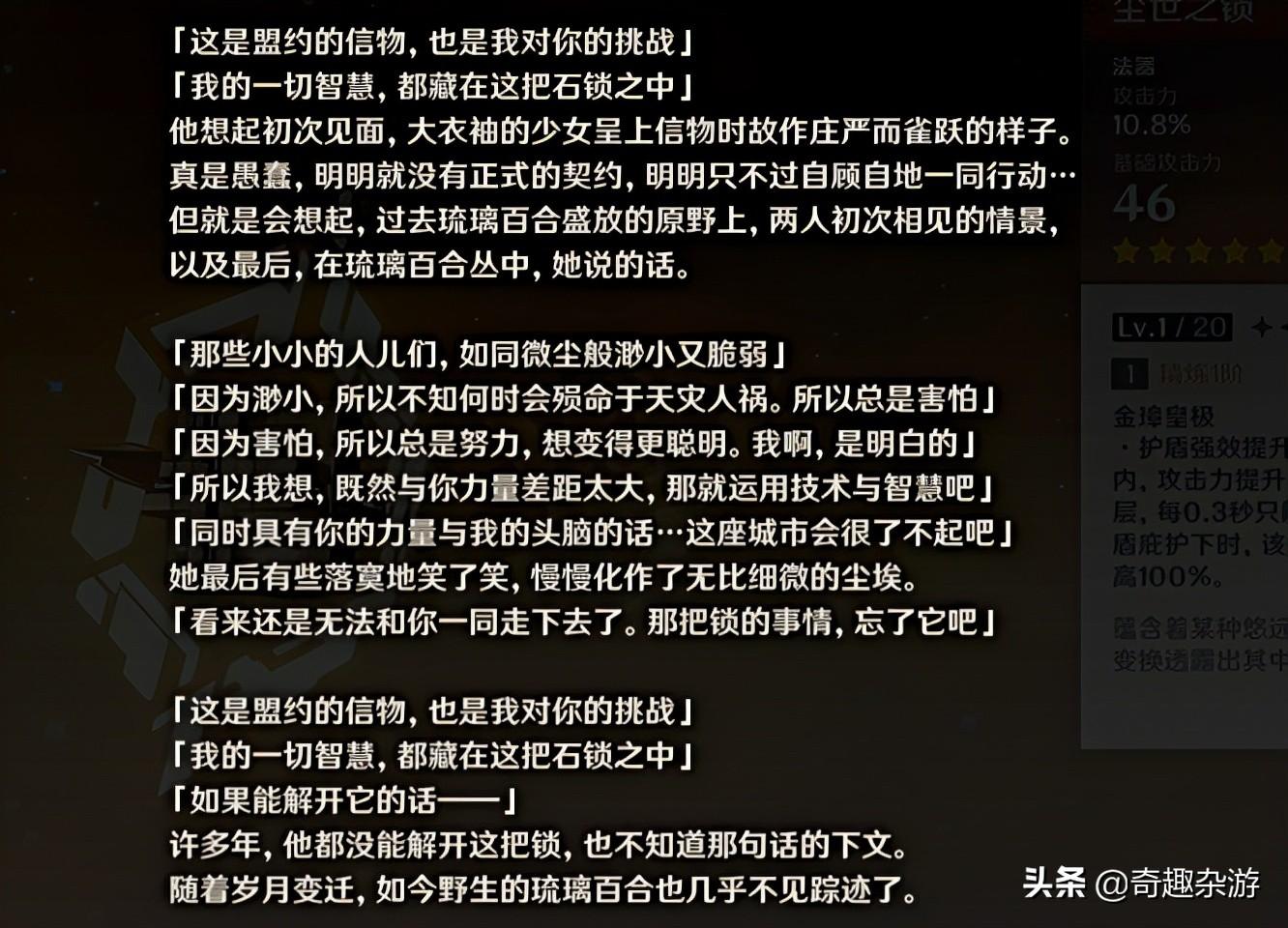 曾经尘神归终,还赠送过一个信物给钟离,那就是“尘世之锁”,在这个锁中,藏着归终的所有“智慧”,如果钟离能解开这个锁,或许有将会有更多故事吧。但是什么这么多年,钟离都没去解呢?或许这个锁的存在,可以证明归终曾经存在过吧。