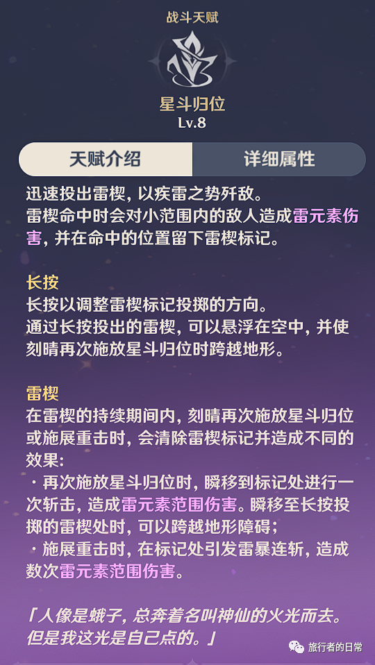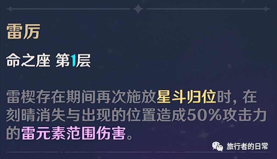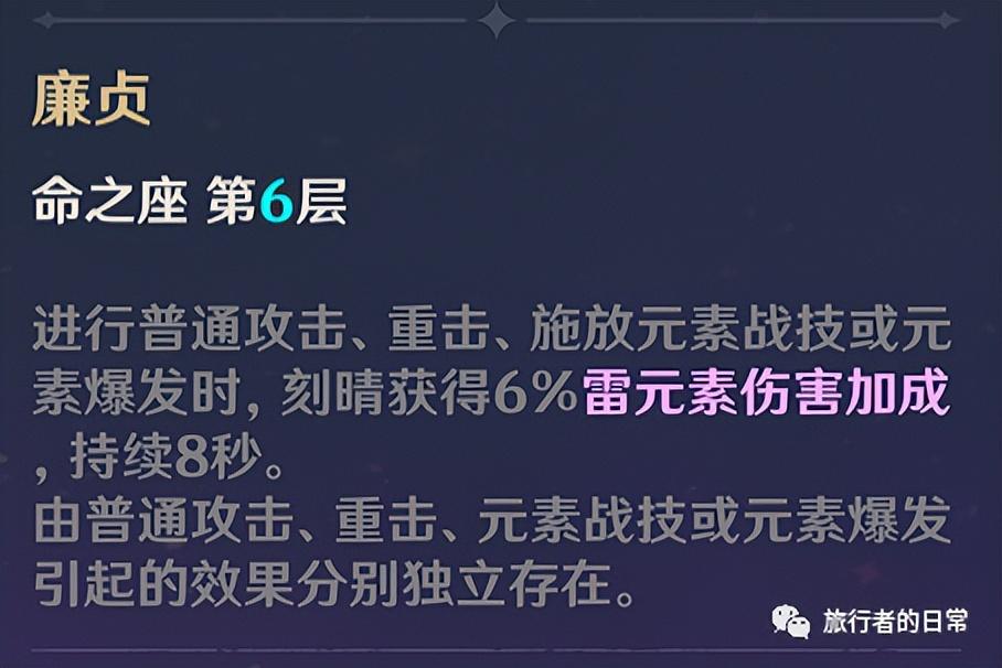 6命:进行普攻,重击,元素战技,元素爆发时,分别增加6%雷元素加成,合计24%,各自独立存在,持续8秒,和4命提升差不多,限制还更多。
