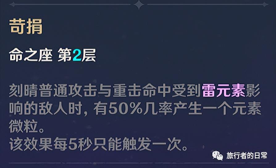 2命:刻晴的普攻重击命中雷元素附着状态下的敌人有50%生成一个雷元素微粒,因为刻晴是主C自身又不缺充能,为了一个球特意切后台角色完全是浪费输出,所以这个命座也基本上没有用